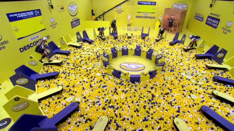 Cada jogador ficará posicionado em um trampolim, em uma piscina cheia de produtos. Sempre que a campainha tocar, é a hora de cair na piscina para escolher um produto. Pode escolher qualquer produto. Posicione o cartão no espaço à frente.