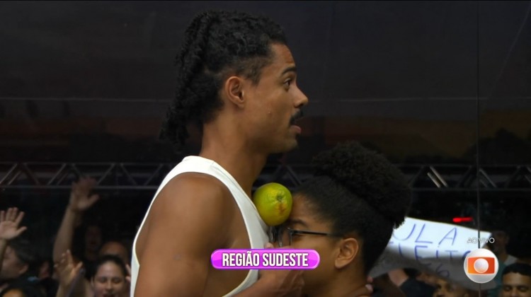 Breno e Milena, que formaram um dupla no desafio da laranja deste sábado (10), protagonizaram um momento inusitado durante a disputa, já que diferença de altura entre os dois ficou bastante evidente: o biólogo, bem mais alto que a recreadora, estava com a laranja posicionada na região do pescoço, enquanto ela equilibrava a fruta com a testa.