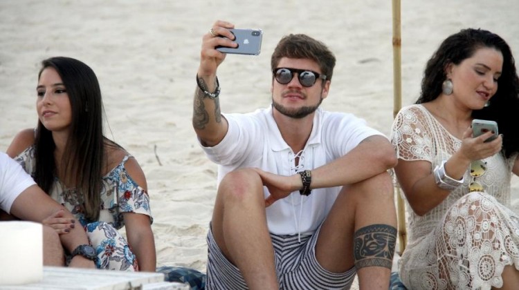 Breno Simões já colhe os frutos da fama. O galã do “BBB18” gravou nesta terça-feira (25) um clipe da cantora sertaneja Janayna, na praia do Recreio, no Rio.